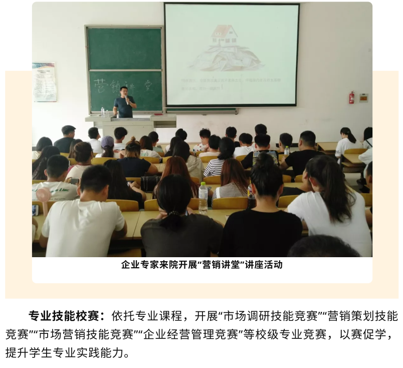 我院市场营销专业,主要面向企业、事业单位及政府机关部门,培养组织管理、市场销售及营销策划等岗位的高素质、高技能营销管理人才。专业开设有商务礼仪、基础会计、经济学基础、经济法、管理学、市场营销基础、商务谈判与沟通技巧、营销策划、电子商务、销售管理、网络营销、现代推销技术等多门课程。经过三年的培养,力求将学员打造成为有学历、有知识、有能力、有视野的高品质商业管理人才。我院市场营销专业现有校内专任教师7人,都拥有多年的专业教学经验,全部教师为本科及以上学历,其中研究生以上学历有5人,本专业还聘有企业兼职教师7人,全部为企业管理层或行业精英,拥有丰富的企业管理及销售实战经验。同时,我院还建设有两个市场营销专业模拟仿真实训室,可同时满足120人的实训教学,为实践教学提供了有力的硬件支持。